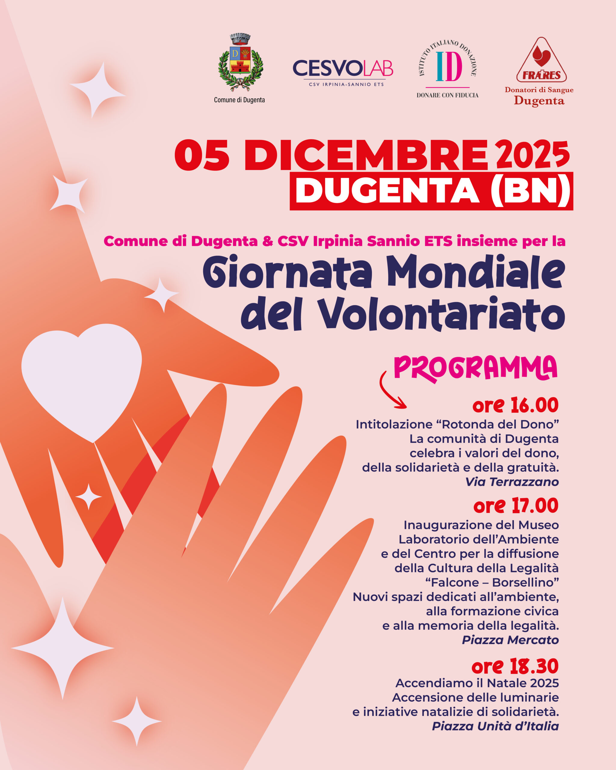 Comune di Dugenta & CSV Irpinia Sannio ETS insieme per la Giornata Mondiale del Volontariato 2025 PROGRAMMA Ore 16:00 — Intitolazione Toponomastica al Dono La comunità di Dugenta celebra dono, solidarieta’ e gratuità. Ore 17:00 — Inaugurazione del Museo Laboratorio dell’Ambiente Centro per la Cultura della Legalità “Falcone – Borsellino” Spazi dedicati a ambiente, formazione...